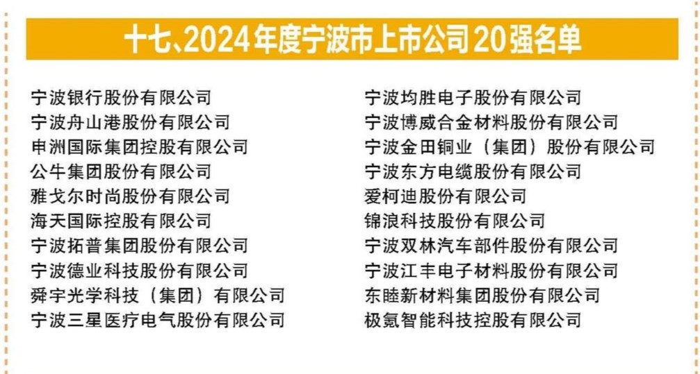 近日,享有“宁波经济奥斯卡奖”盛誉的2025宁波创业创新风云榜评选结果正式揭晓。双林股份(300100.SZ)凭借稳健的业绩表现与高质量发展成效,成功入选“2024宁波上市公司20强”榜单。在竞争激烈的资本市场中获得此项权威认可,充分彰显了公司的综合实力。